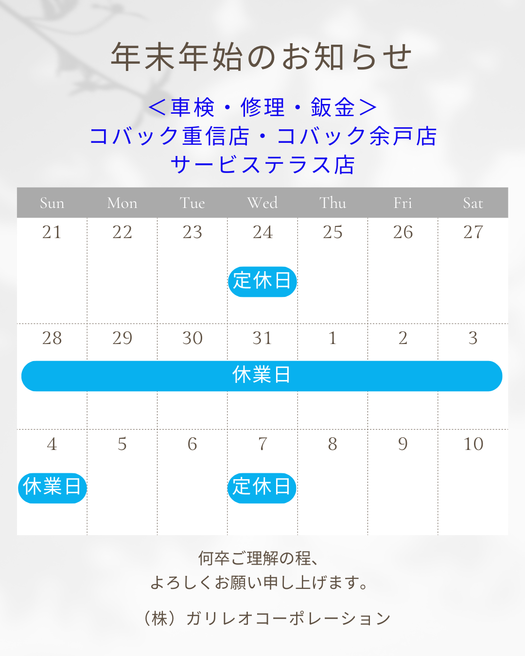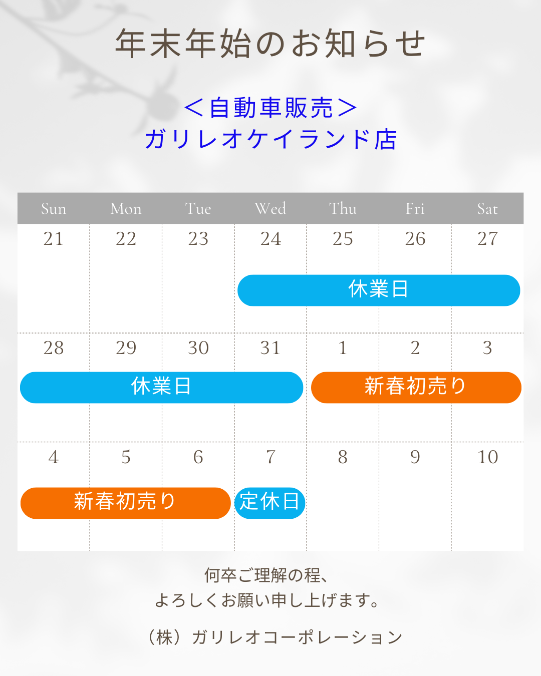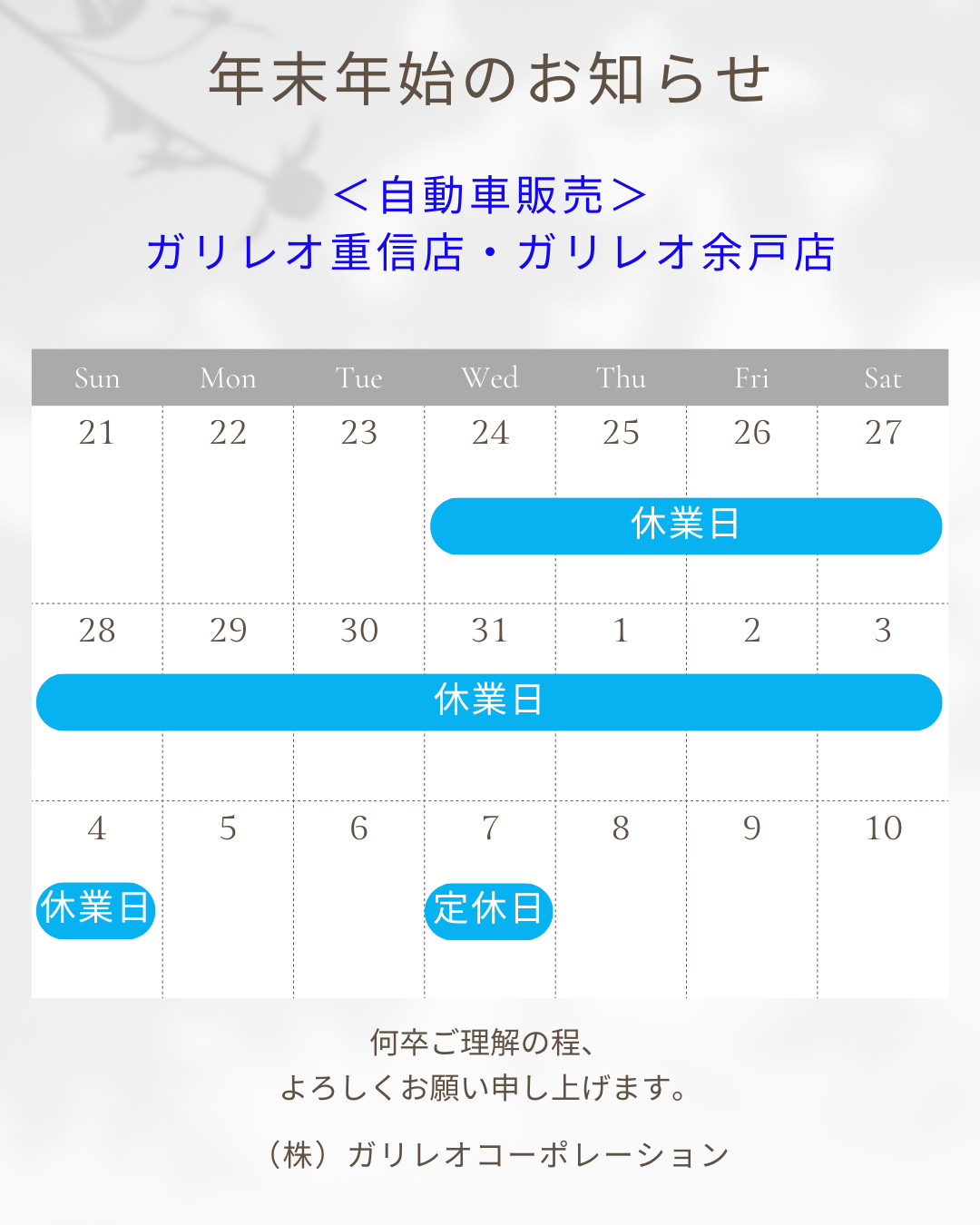 ガリレオ余戸店(自動車販売)につきましては12/24(水)~1/4(日)までお休みさせていただきます。